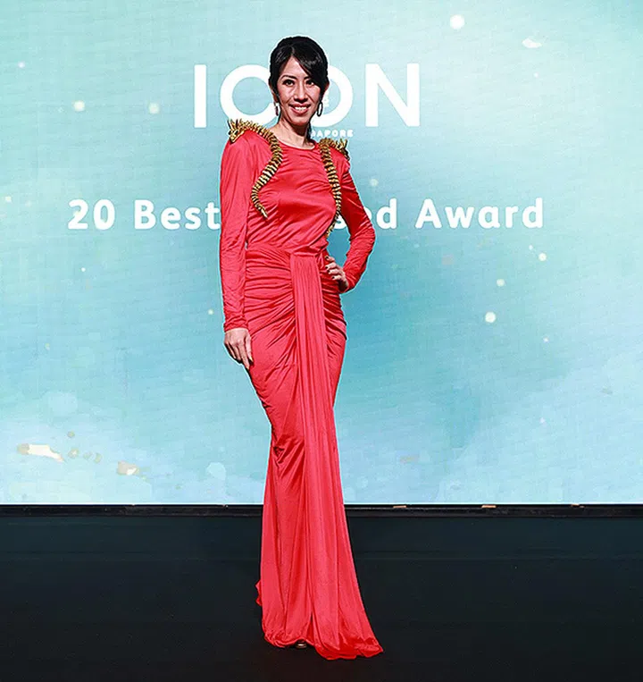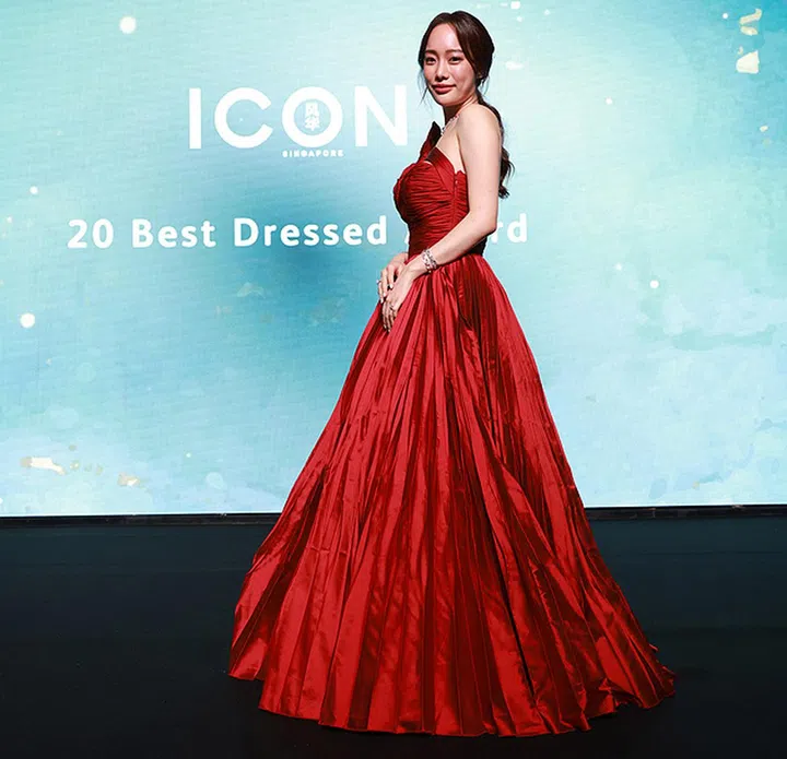 在东方文化中,红色象征着吉祥和喜庆。Zanelle Lim特别挑选了一件由Stylelease提供的Tarik Ediz晚礼服,以深红色为主色调,在光线下闪耀出液体般的流动光泽。裙身剪裁简洁柔美,采用光面百褶裙摆,上身点缀着蝴蝶细节,不仅平添了高贵气质,还展现和放大女性阴柔之美。