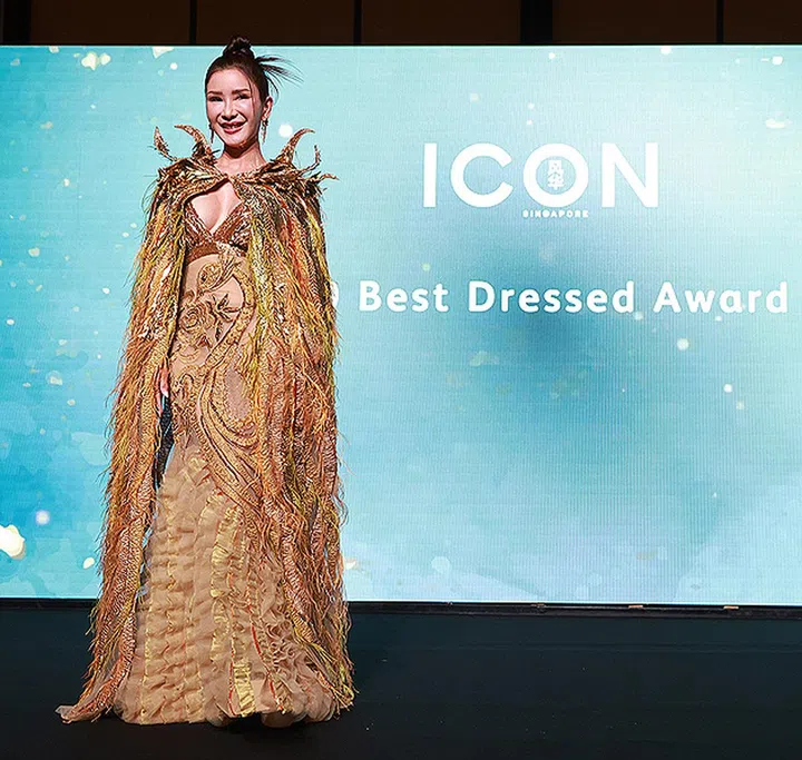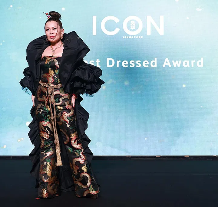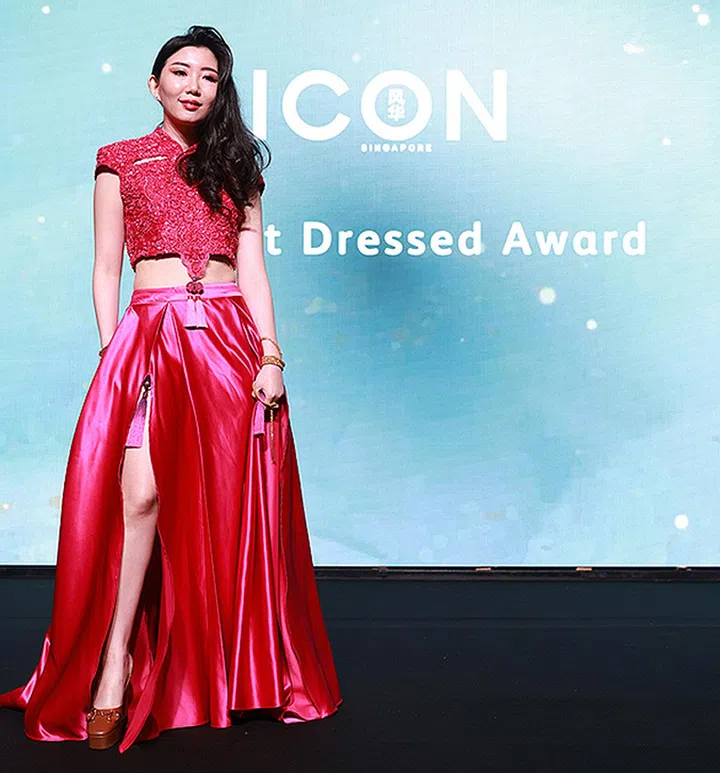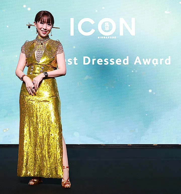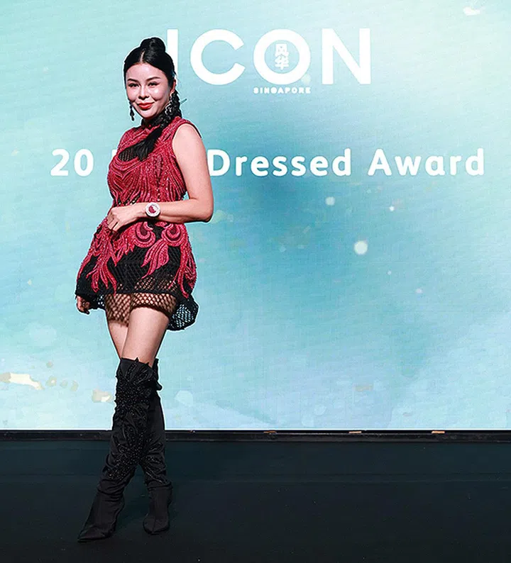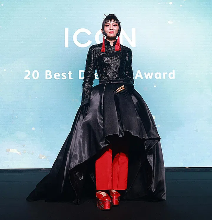 为了打破传统服装所带来的老套、俗气的印象,Sharel Ho邀请本地设计师Frederick Lee打造了一款独具创意的新中式造型。这件服装采用雕塑形网状轮廓,饰有工艺复杂的刺绣和盘口细节,在搭上配套黑色及膝靴,独特新颖的造型不仅保留了东方美学,还兼具现代时尚感,华丽中显露品味与个性。