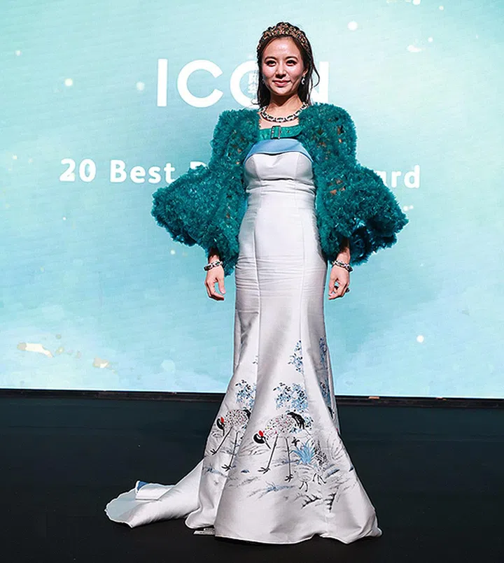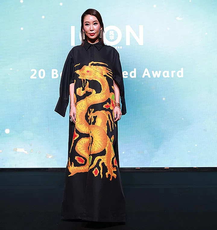 每每出席《风华》晚宴都精心打扮的Susanna Kang,以一袭Isabel Sanchis造型现身。绣满精致龙图腾连体裤,搭配结强势立体的黑色长款大衣,一转身可见大衣上的孔雀刺绣,巧妙运用东方元素,将其高雅气质衬托出来。她也以卡地亚(Cartier)珠宝及腕表做点缀,为霸气穿搭增添一抹迷人格调。