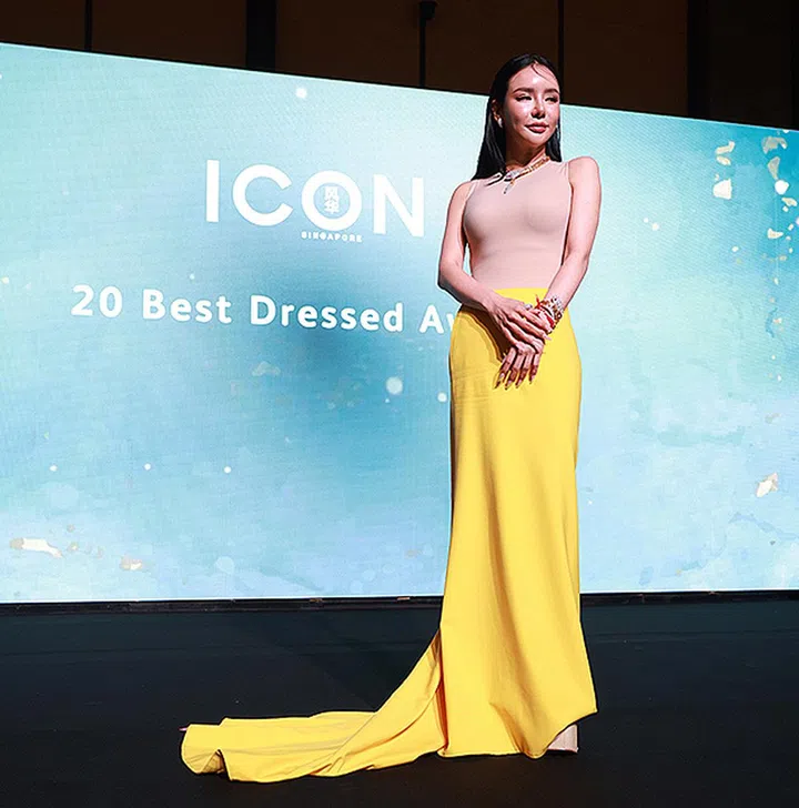 简单就是美。特地从伦敦返回狮城出席晚宴的Kim Lim,以一袭简介大方的Valentino晚礼服,佩戴宝格丽(Bulgari)高级珠宝亮相。上身采用裸色紧身设计,配上鲜艳的黄色裙摆,整体呈现流线型轮廓,线条流畅,展现出女性优美的身材曲线。黄色在中国传统色彩文化中居于崇高的地位,有着高贵、吉祥的文化含义。
