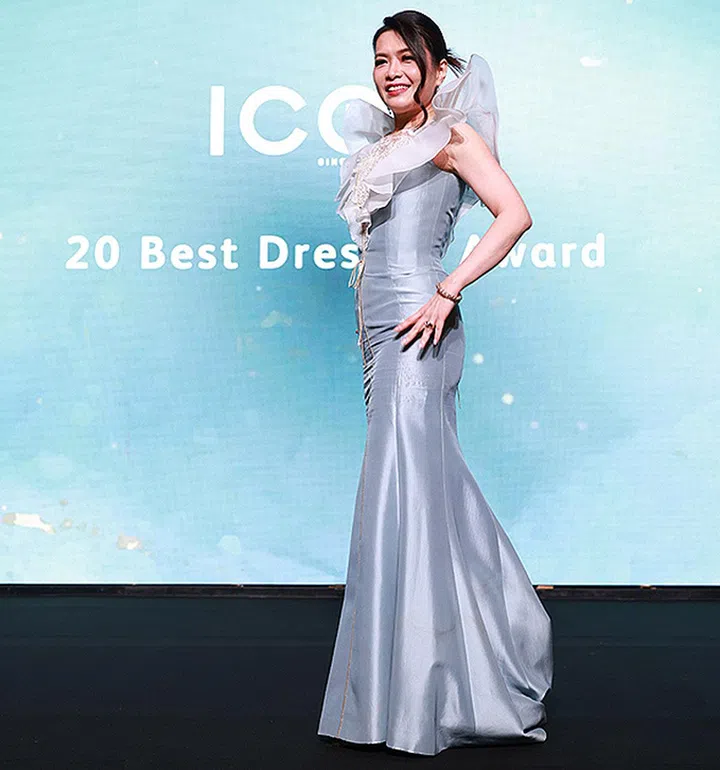 中国设计师郭培通过精湛的设计与针线技艺,将东方传统的素雅之风刻画得淋漓尽致。Ho Chi Ling的Guo Pei礼服以恰到好处的贴身剪裁,展现了她锻炼有佳的好身材。袖子采用薄纱材质构建了立体的廓形,与胸前精致的刺绣设计,共同营造出华贵和层次感,使她的气质格外出众。