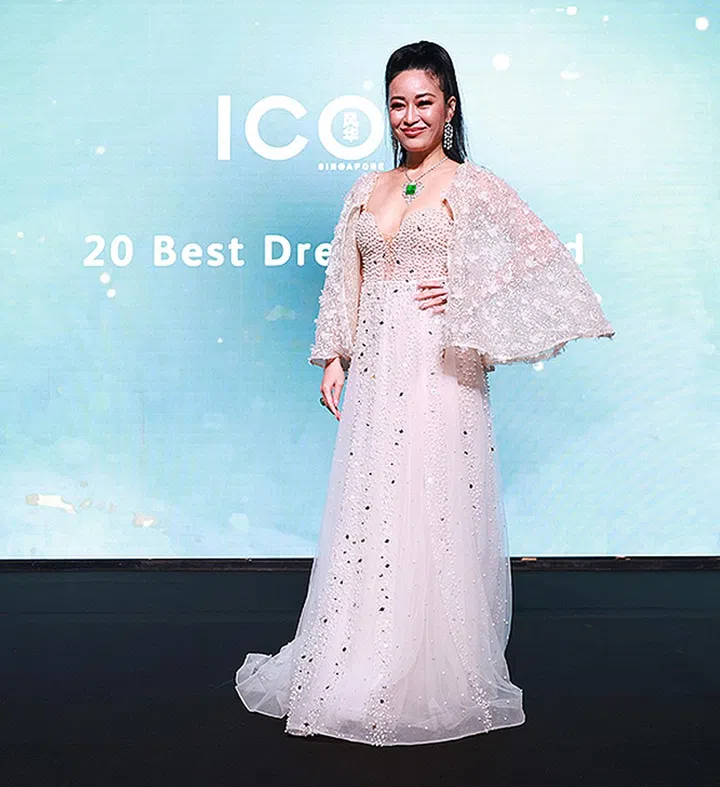 Nina Ng身着Julie Vino白色晚礼服,该品牌以高品质的时尚前卫设计而闻名。礼服缀满珍珠和亮片,在灯光下闪烁夺目,令人眼前一亮。此外,飘逸的精致长袖设计上布满了细腻的刺绣,完美诠释了其迷人的魅力。她还佩戴来自Larry Jewelry的祖母绿项链,充满东方风情的神秘韵味。