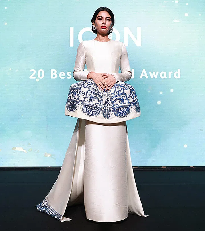 陶瓷是东方美学的经典元素。Shabnam Arashan这一身Tiiya高级定制礼服就善用了该元素,在剪裁摩登的礼服上完美呈现。原是一件典雅大方的缎面礼服,却融合了陶瓷印花立体质感裙摆及拖尾设计,呈现出华丽而不浮夸的风格,将摩登东方美学操纵得出神入化。