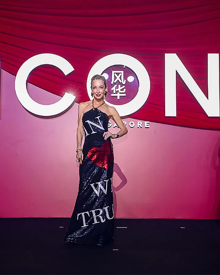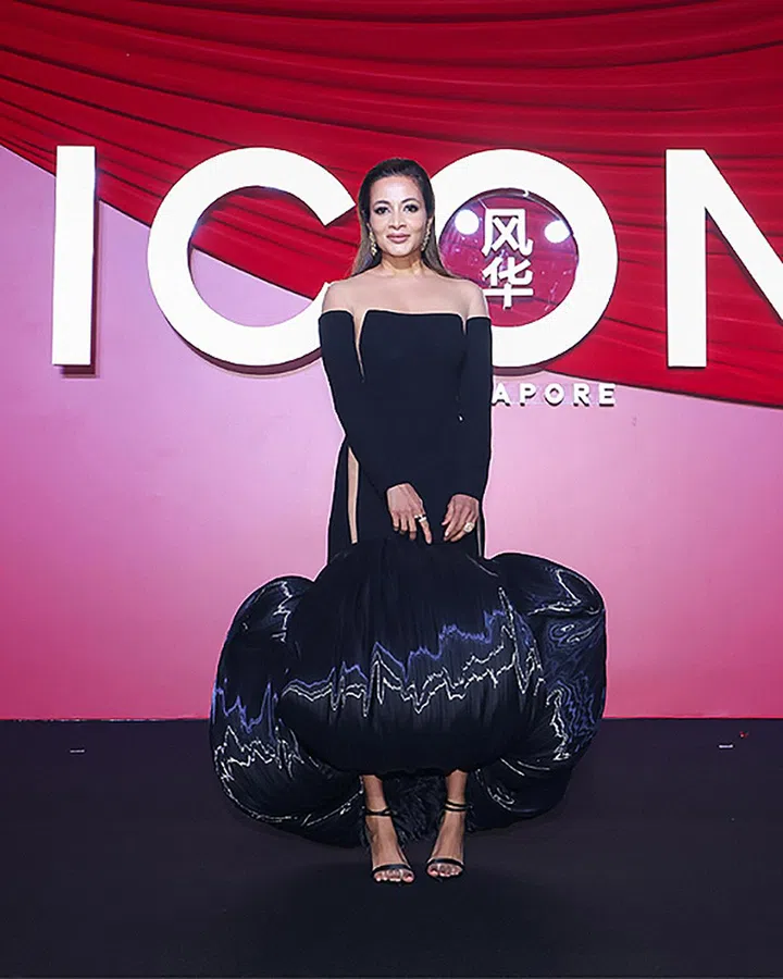Iroshini Chua医生这一袭Isabel Sanchis连衣裙,以其大胆而抢眼的结构性设计在晚宴上成为焦点。这件礼服的线条既有结构感又不失性感魅力,巧妙地融合了摩登美感与时尚气息。配饰方面,她保持了简洁的风格,以一对耳环,搭配Tom Ford黑金相间的晚宴包以及Le Silla羽毛高跟鞋,恰到好处地体现了她的时尚品味。