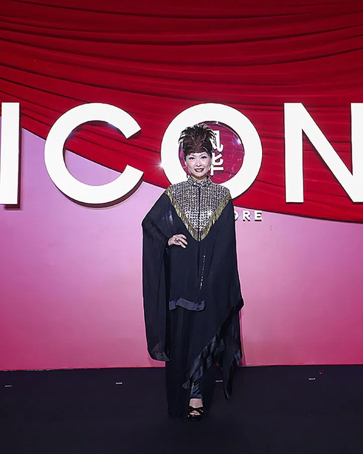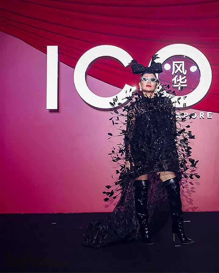 为了支持本地设计师品牌,郭睿婷选择了代表新加坡参加巴黎时装周的本地设计师Kavita Thulasidas打造的黑色晚礼服。这件礼服巧妙地运用了镜片装饰,不仅反映她在2024年所倡导的“自爱”和“自我反思”主题。这些破碎镜片的设计,也以其不完美的完美展现了独特的艺术美学。她的手袋来自本地设计师的Ethan K,头饰则来自George Zamau’l Couture,轻松为造型加分。