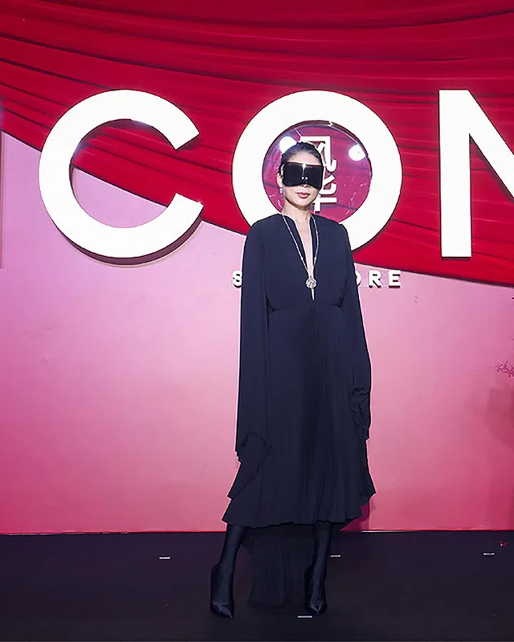 江丽晴身着Frederick Lee Couture的黑色羽毛礼服,飘逸的羽毛设计增加了造型的立体感和视觉冲击力,使她在人群中格外突出。她的造型还包括醒目的漆皮高筒靴和精致的头饰,配戴Cartier钻石耳环、Patek Philippe精表以及Louis Vuitton金色手拿包,进一步增添高雅与奢华。值得一提的,她佩戴的Tiffany & Co.猫眼太阳镜是全球限量发行的20支之一,与国际巨星Beyonce在演唱会上佩戴的同款,完美演绎大会主题。