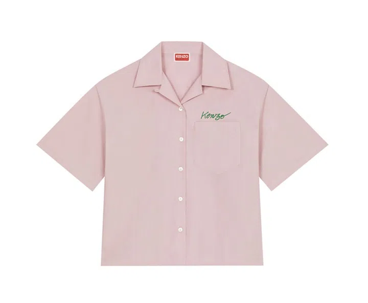 这一款淡雅灰粉色的夏威夷衬衫,胸前口袋为绿色(如花茎般色彩)“Kenzo”字样,背后为一朵超大的罂粟花印花,可搭配红色罂粟印花裙装穿着。
