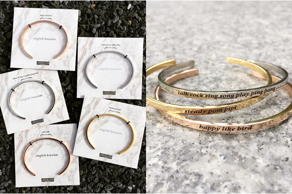 16 Feb 2016很新加坡的SINGLISH手镯NUYOU TeambraceletscoolfashionmustbuyshoppingSinglish是本地独有文化,早就融入我们的日常生活里。除了说Singlish,有没有想过将Singlish穿戴上手?Love SG 品牌就推出超可爱的Singlish手镯,绝对很“新加坡”!品牌创办人和设计师原本只把这个点子当做“wild idea",但又觉得Singlish这个新加坡元素,不仅独一无二又别具意义,很值得发扬光大,因此用它打造成饰品设计。这些会让你发出会心一笑的设计,包括标上“Stylo Milo" , "Happy Like Bird" 和 “Steady Pom Pi Pi"等字眼的珍藏版手镯。手镯为纯手工打造,限量出售。售价 $29.90, 可点击此网站购买。分享文章: