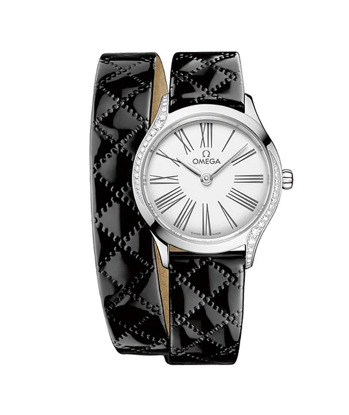 Omega早前于情人节推出一系列新款De Ville Mini Trésor腕表,在延续其纤薄优雅风格的基础上,引入全新表带设计,以多种配色及材质为腕表注入不同的浪漫气质。该Mini Trésor系列作为品牌极受欢迎的女表系列之一,拥有小巧的26mm表壳,镜面表壳背后装饰“Her Time”特色花纹,细节设计也散发无尽精致美。上图表款采用绗缝菱形图案的黑色亮漆小牛皮双圈表带,可搭配干练职场装,也能灵活搭配炫酷时尚looks。