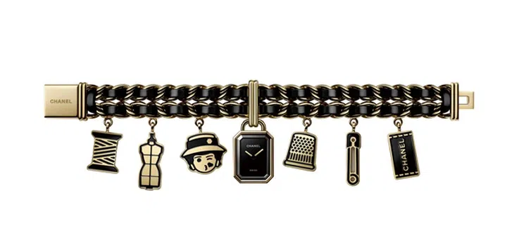 表款来自Chanel Couture O’clock限定系列,品牌将顶针、剪刀及别针等在康朋街高级定制服工坊中的常用工具,与制表、珠宝和极致的精湛工艺巧妙结合,幻化为非凡时计 。上图这款重新演绎的Première腕表,采用镀金精钢和黑色漆面,并点缀饰线筒、顶针和Chanel女士吊饰,搭配腕表的经典皮穿链表带,呼应Chanel的经典菱格纹手袋链条。