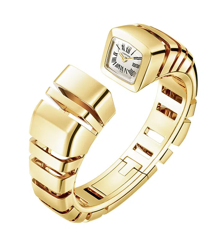 凝聚品牌制表工艺及珠宝工艺的全新Reflection de Cartier腕表,以开口手镯为灵感构建出丰盈饱满的新颖结构。最大特色?是其开口处一侧为小巧表盘,一侧为镜面相对,隔空映射出张力无限的时间逆流之美。Reflection de Cartier系列提供黄金、玫瑰金表款以及白金镶钻表款,并包括两款镶嵌不同颜色宝石的白金款式。品牌珠宝与腕表作品总监Marie-Laure Cerede形容,该腕表充满创造性并演绎出时间之形,整体结构犹如被“打碎”的链节,精妙的断层和镜面效果更是令人着迷!