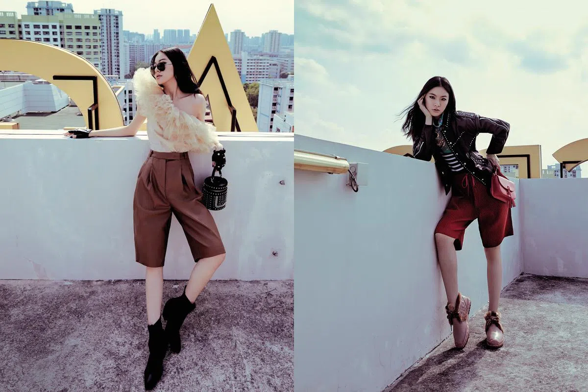 再次说:造型需有对比才精彩!设计独特的人造皮打褶短裤,搭配柔美的单肩上衣,软硬兼施! 再加街头感重的铆钉手袋、 墨镜、短靴和皮手套, 回头率肯定超高!