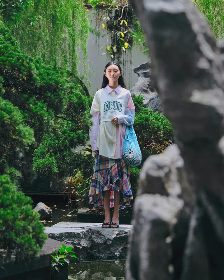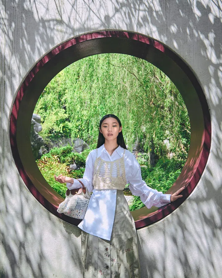 将钩针吊带上衣穿在衬衫外,既能为造型增添层次感又能稍微修饰整体曲线。搭配带有童趣刺绣的过膝裙,整体造型散发轻松的女性化味道。