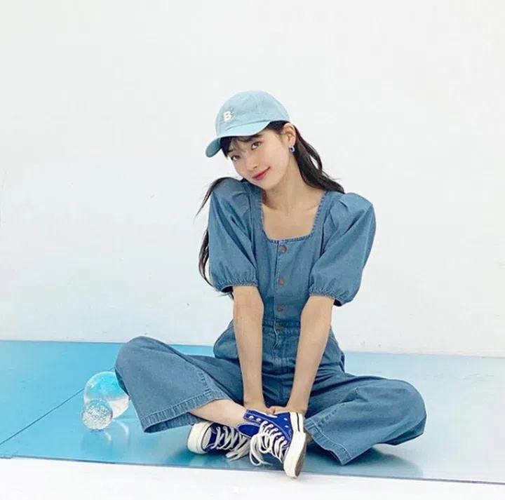 白色球鞋是最安全的选择,几乎能搭配任何类型的服饰。如果觉得白色太单调,不妨考虑入手秀智这一款经典的Converse Chuck 70高帮帆布鞋,名为“Rush Blue”的亮蓝色调抢眼醒目。此外,也可以拷贝秀智的穿搭法则,以蓝色单宁连身裤配帽子,同色系主题穿搭,营造出和谐一致的视觉美感。