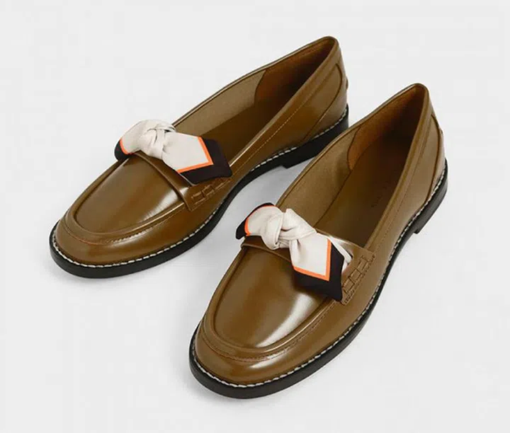 设计线条简约的乐福鞋,洋溢着文艺气息。橄榄色+丝质蝴蝶结的配色设计,不论是搭配长裤或连衣裙都没问题。