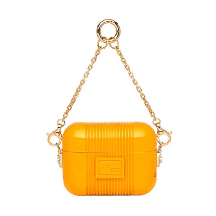 Fendi与伦敦配饰潮牌CHAOS推出限量联名系列,这款酷炫的耳机盒轻松夺人眼球。橙瓷漆金属材质制作,盒身饰有FF图案,配搭金属链,个性十足。