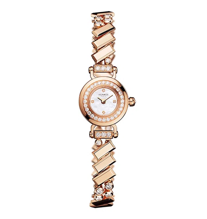 这款迷你腕表灵感源自品牌2014年的Faubourg腕表。新款腕表再现珍珠贝母表盘及小型圆形表壳的经典外观,但品牌重新演绎表链,以闪亮圆点及矩形斜块进行拼接,展现抽象艺术之美。设计上,腕表融合高级珠宝工艺,并提供白金、玫瑰金及镶钻和全面铺钻等5种款式(上图所示表款还有表链无镶钻款式可选),风格华贵又有简约现代美感。