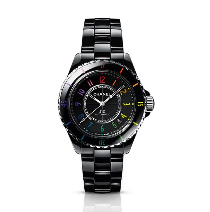 今年Chanel从1990年代蓬勃发展的电子音乐撷取灵感,推出一系列色彩炫目的Electro系列腕表。这个J12 Electro edition先行推出四款限定腕表作品:J12 X-RAY Calibre 3.1镂空腕表(限量12枚),J12 Electro Dream白色腕表(限量55枚),J12 Electro Star全镶钻及彩色蓝宝石腕表(限量12枚),以及包含12枚黑色镶彩色蓝宝石的J12腕表的J12 Electro Box礼盒。今年7月,品牌还会发售以荧光彩漆装饰的J12 Electro腕表(限量1,255枚)。