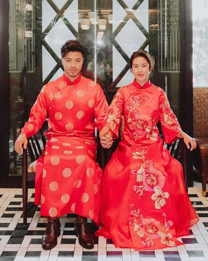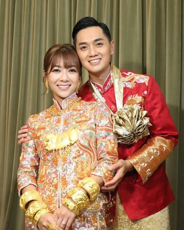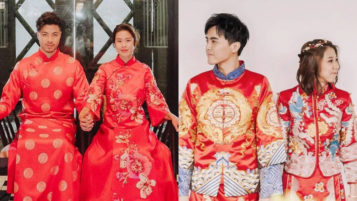 何维健去年4月于Instagram公布婚讯,两人在照片中身穿本地婚纱公司Lacebridge的裙褂。有别于两对港星夫妇的传统刺绣裙褂,他们穿的是现代版——露出更多红色缎綢,还有以珍珠缀饰的两层衣袖。