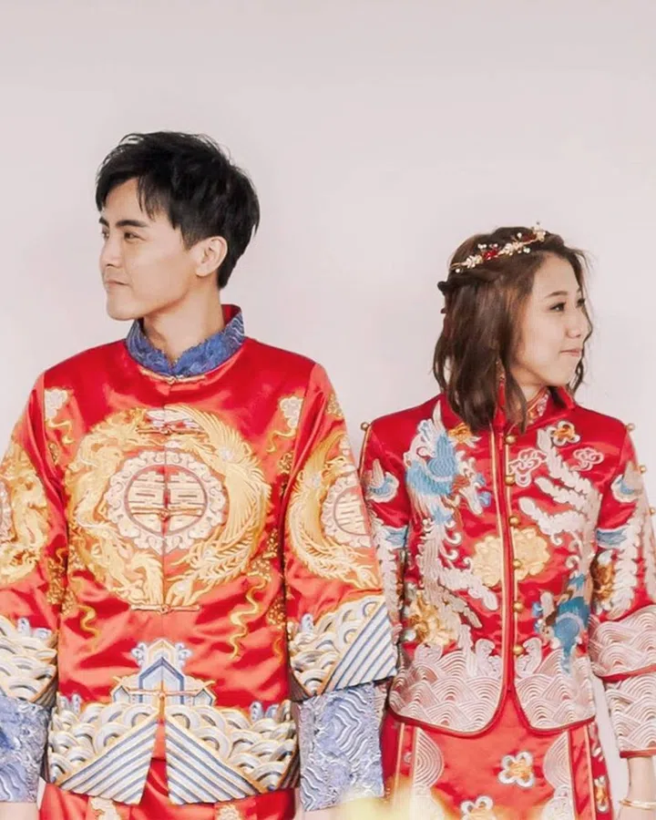 接新娘当天,袁伟豪和张宝儿都穿上早前拍摄复古婚纱照时的中式礼服。新郎穿龙、新娘穿凤,演绎华丽的中国风。