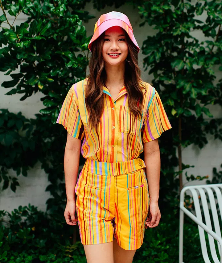 图中所示就是另一种穿法——挑选以黄色为底,但是有线条或图案的设计。