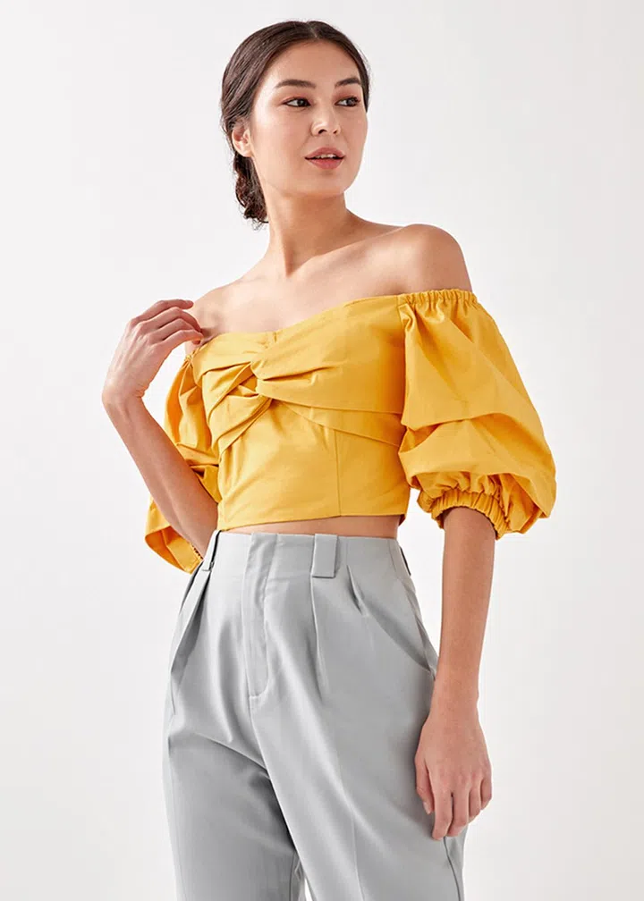 如果觉得大面积的黄色,太过“刺眼”。那么像这样接近平口的露肩设计,其实不难驾驭。而且下半身的色彩怎么搭,可以根据你的“冒险度”——撞色或者走和谐的色系。