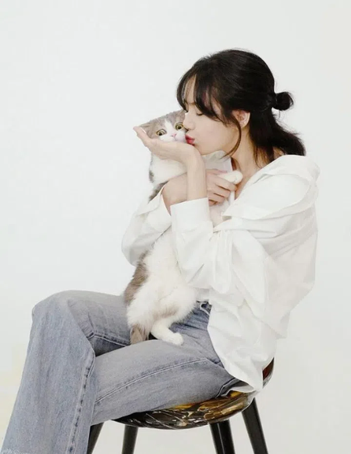 在与宠物爱猫的这辑照片中,Lisa身穿Y Project的oversized宽领白衬衫,搭配一件简单的毛边牛仔裤。白衬衫+牛仔裤的穿搭经典不败,不会出错。希望让造型升级加分的话,可以学Lisa选搭带点设计感的白衬衫。可搭配袖子加大、剪裁不对称,或有设计层次的白衬衫。
