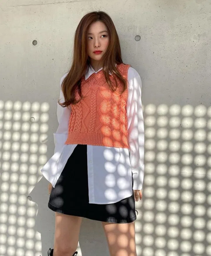 Red Velvet瑟琪以多层次的穿搭为经典白衬衫添加俏皮个性。女孩学院风造型,选择搭配亮橘色针织背心,让本来一板一眼的白衬衫+黑色牛仔迷你裙瞬间加分。再配上漆皮牛仔靴,甜美又俏皮。选穿针织背心时得注意其颜色及图案,鲜艳色系的背心应该以中性色调来进行搭配。而如果白衬衫是oversized版型设计,背心也应选穿大号的;短版背心则可选搭高腰裤。