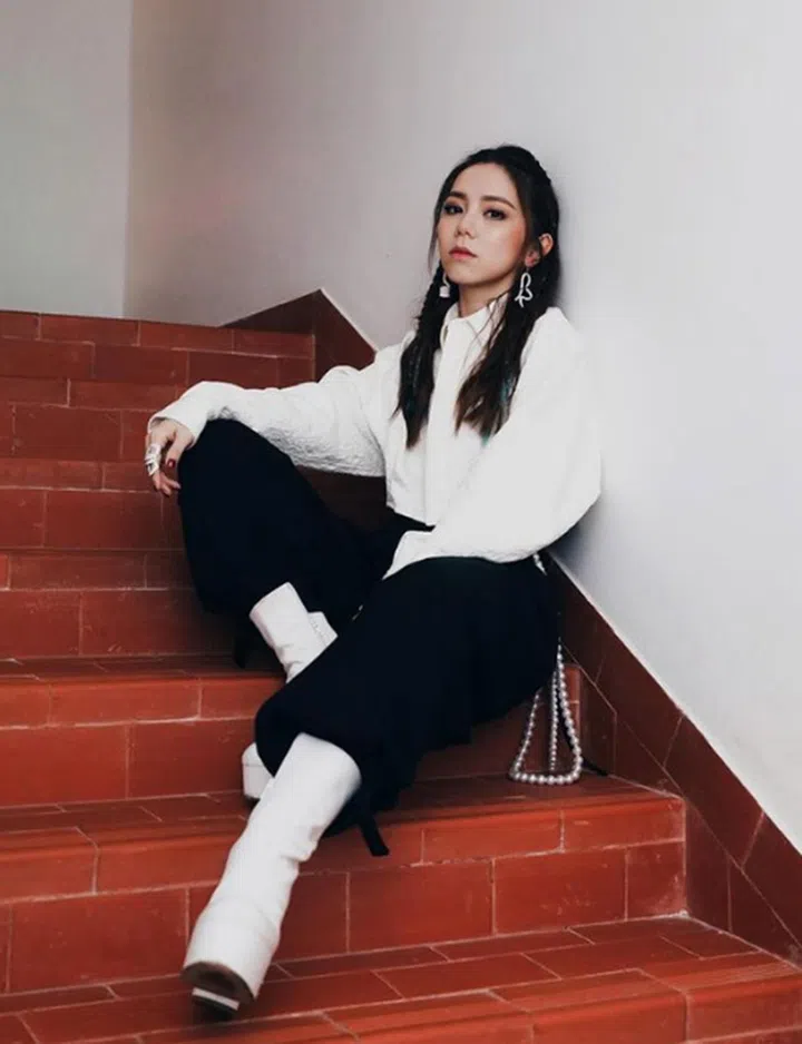 G.E.M这袭舞台感十足的造型,结合不规则纹理材质白衬衫+黑色高腰裤+腰间垂挂珍珠缀饰,即摇滚又时尚。想重现G.E.M这款造型,可选纸袋裤来搭配白衬衫,再配上高跟踝靴将身材比例拉长。