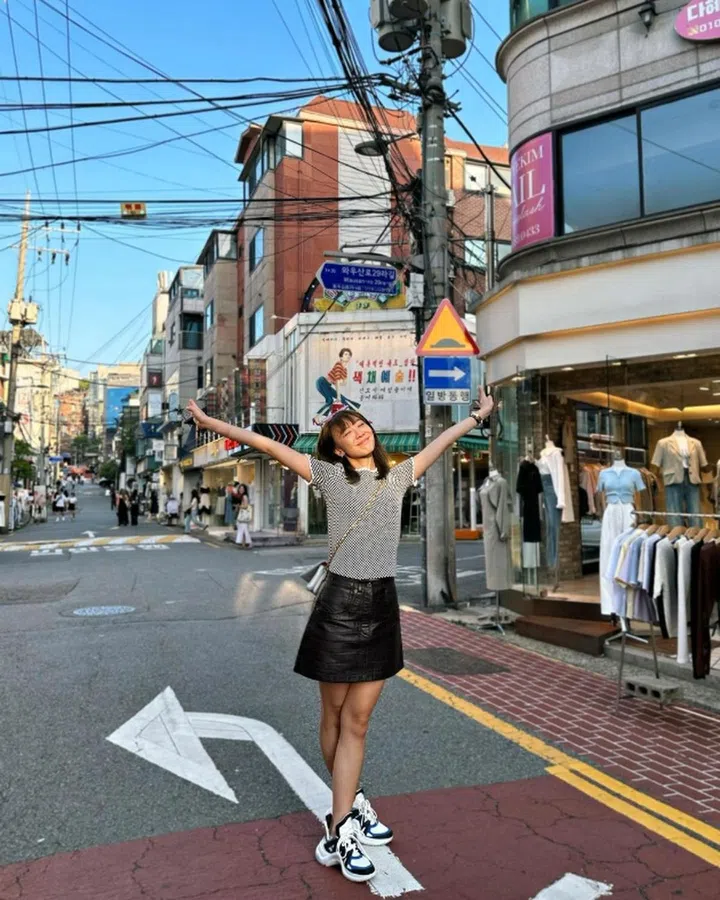 皮裙也可以穿得俏皮可爱噢!走在韩国街头的陈欣淇,就以皮裙搭配黑白格纹的T-Shirt和球鞋,是不是很有青春活力?