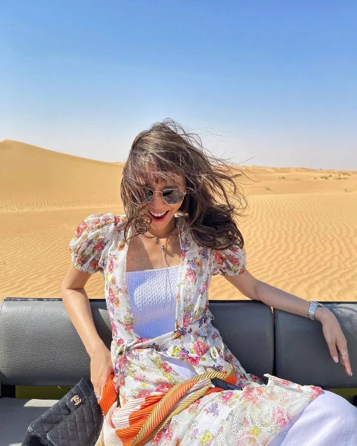 靓丽的碎花图案连衣裙可是非常出片~ 旅游时可要带上一件拍美美的照片噢!如果不确定自己是否能hold住碎花图案,可以学陈欣淇将碎花图案的外衫+纯色内搭,瞬间打造出层次感。