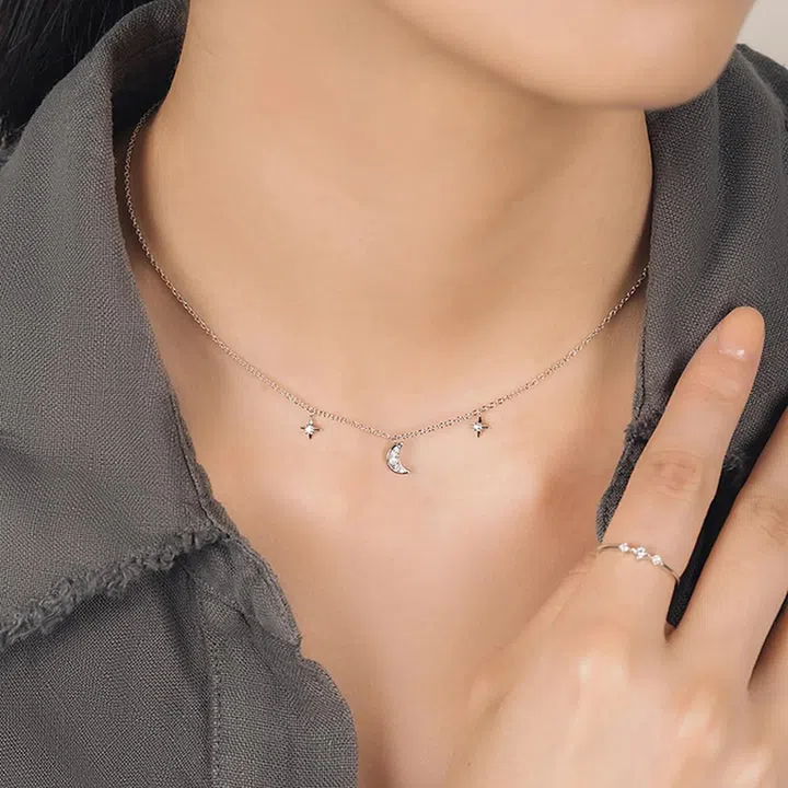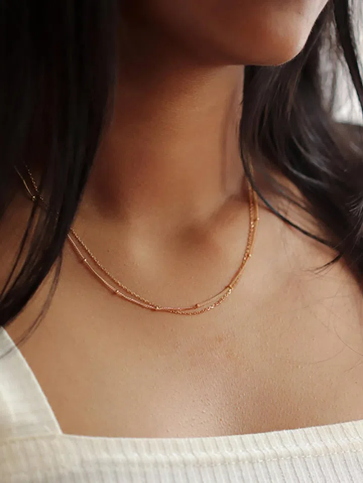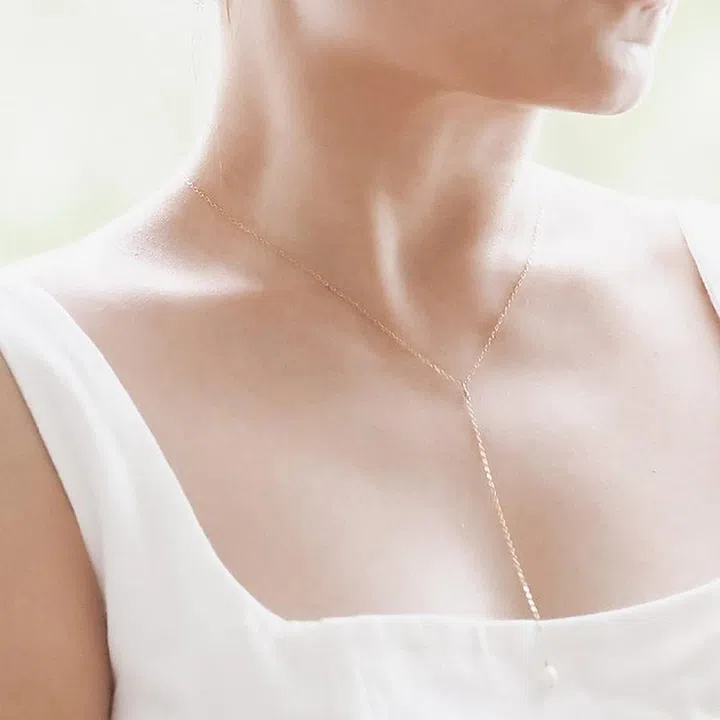 似有若无的简洁链条,散发着一种温柔又妩媚的气质。这条项链最适合搭配V领或宽领的上衣,从而让项链贴合肌肤,衬托出颈部至胸部的优雅线条。