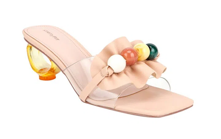 新春的色彩纷纷集中在这双凉鞋上。亮眼的串珠与皱褶设计颇俏皮,而趣味十足的鞋跟更为整体造型增添了惊喜。建议与白色宽腿长裤和黄色上衣相搭配。