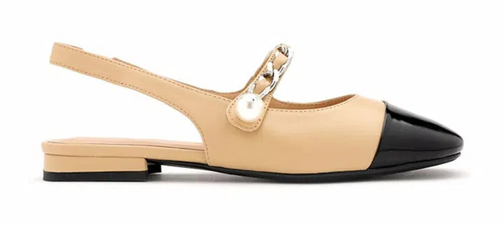 这双以皮革制的平底鞋兼顾了新年里鞋子的两大最重要元素:舒适+华丽。鞋子绑带上饰有珍珠以及金属细节,为造型增添精致的美感。米色与黑色的颜色拼接展现出时尚态度,新年后依然能搭配平日穿着。