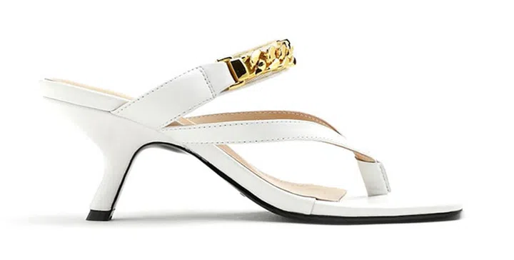 线条简练的方头凉鞋以硬朗奢华的金色链条点缀,穿上后可优雅地展露你的前卫风格。建议与一样前卫设计的牛仔长裤搭配,新年里炫出你的潮人范。