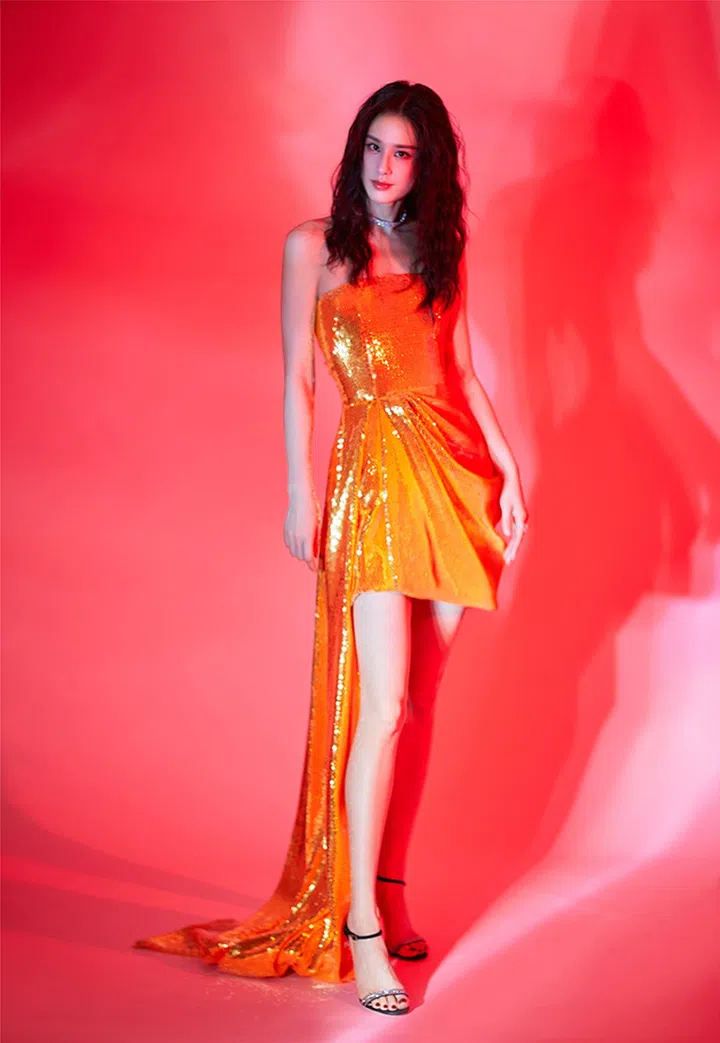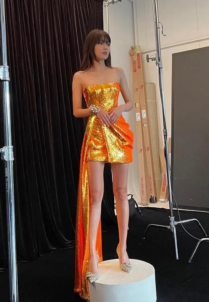 《女友》封面女星崔秀英早前在IG分享的照片中,身穿Alex Perry橘色亮片礼服,搭配Jimmy Choo亮粉缀饰高跟鞋,从头“闪”到脚。