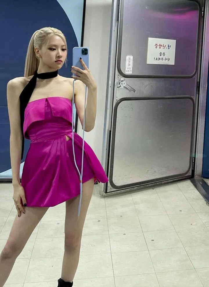 Rosé在solo单曲《On The Ground》MV中出现的桃红色晚礼服就是Alex Perry。在现场演出时,她再次穿上并将裙摆剪短,改版后的精简造型同样出挑。