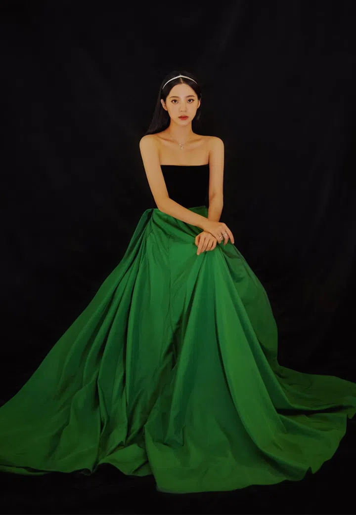 欧阳娜娜选择以Alex Perry黑丝绒及绿缎面拼接礼服,登上舞台演奏大提琴。同时,她佩戴了Chaumet皇冠及项链,展现出贵气的皇室范。