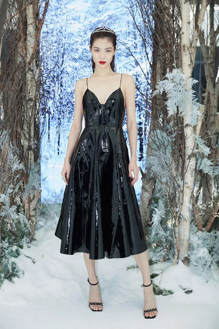 钟楚曦身穿Alex Perry漆皮吊带连衣裙出席Chaumet派对,散发女特工的性感与酷帅个性。