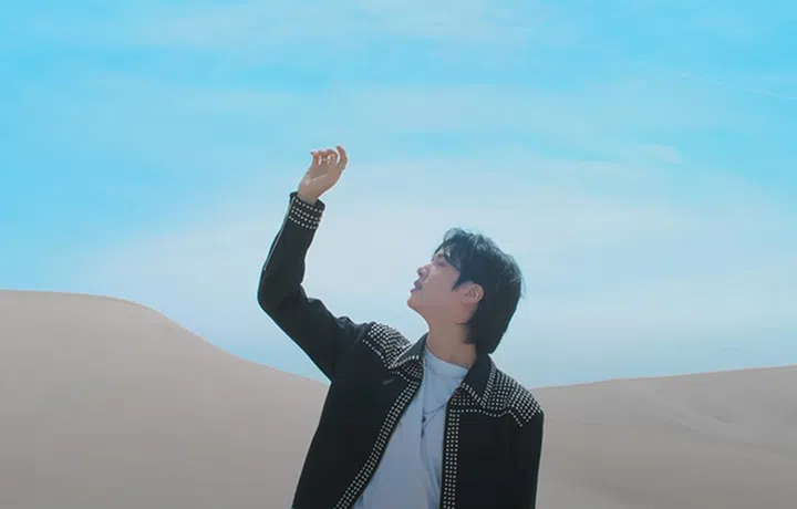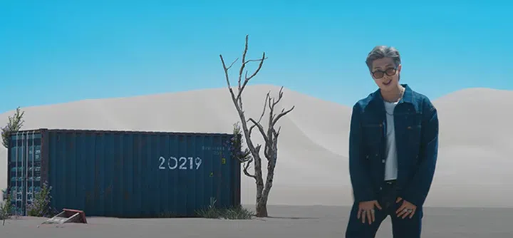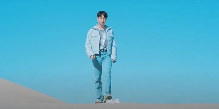 沙漠上出现一片绿洲,而SUGA闵玧其身穿设计师品牌Wooyoungmi的尼龙外套,搭配一系列暗黑风牛仔裤、Bottega Veneta Lug皮靴、贝雷帽以及Saint Laurent 皮革腰带,自得其然的在诉说(唱)着对音乐的热爱,叛逆中带有一丝浪漫情怀。