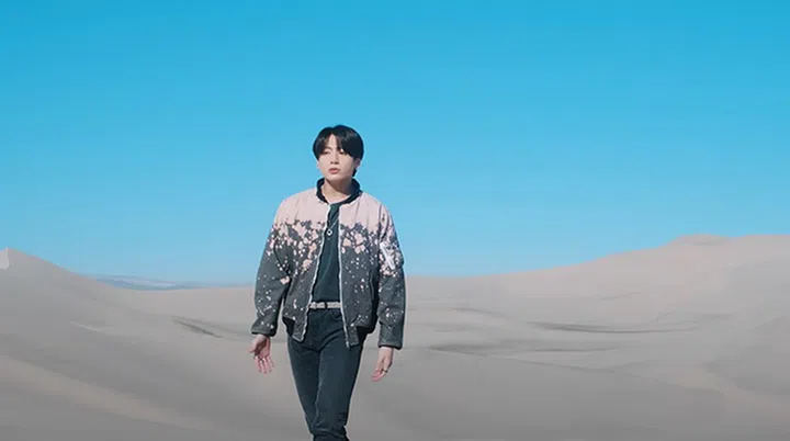 Jungkok田柾国游走在沙漠上,并以NOMA T.D. 的漂染飞行员夹克呼应着身边的环境。这款独有的夹克是在日本经过手工漂色而完成的, 像极了天空中飘下的雪花。