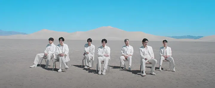 MV开场,防弹少年团在一望无际的沙漠上,身穿来自首尔男士服装品牌TAILORABLE的量身定制西装,一身洁白的回归初衷,帅气登场。