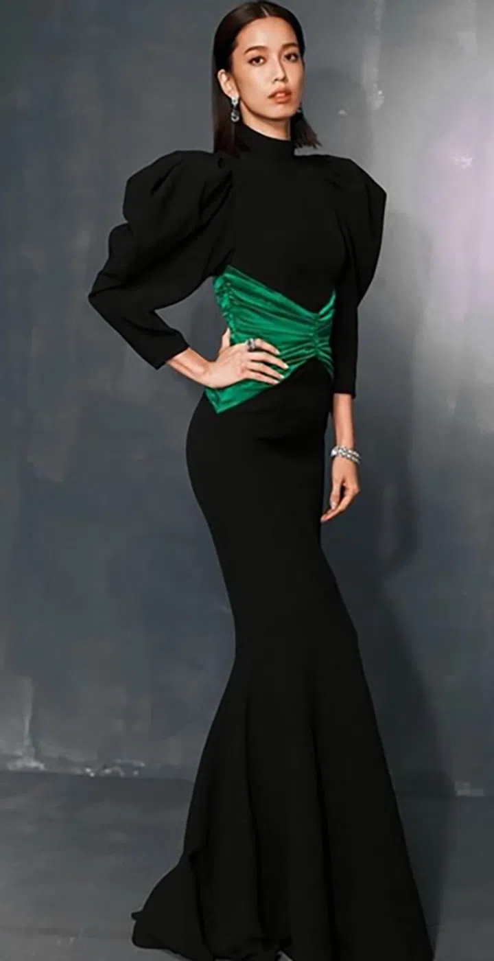 Andrew Gn的设计对体现女人的美非常在意。他所设计的作品都流露出浓浓的现代奢华感。陈庭妮身穿的SS2022系列中的黑色绉纱晚礼服,设计上采用了浮夸的蓬蓬袖设计,腰间搭配绿色丝缎垂坠设计细节,体现了宛如雕塑般的形态,完美勾勒出女人的线条。