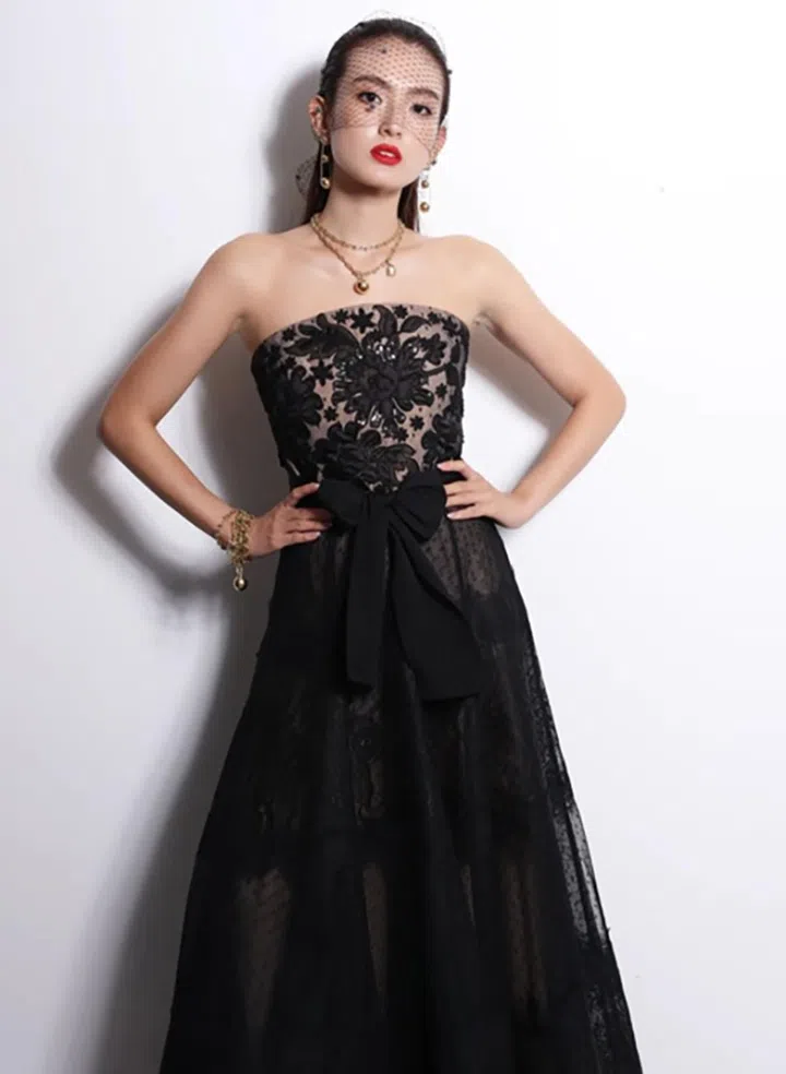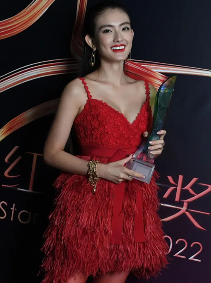 《红星大奖2022》颁奖典礼上,Andrew Gn的设计频频出现。其中,洪凌就穿上了两套来自Andrew Gn的晚礼服。红毯上,洪凌选择了Andrew Gn的一袭黑色蕾丝薄纱平口连身裙。造型上搭配网眼眼罩,穿出复古、高雅的旧好莱坞glamour。