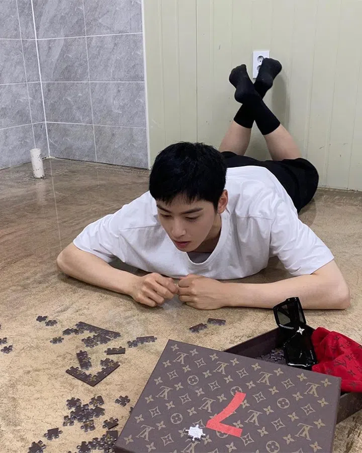Louis Vuitton男装秀的邀请函每季都精彩,继上次的纸飞机,这回是拼图!韩星车银优身穿简单的白T及黑短裤,边在家拼图边看直播。