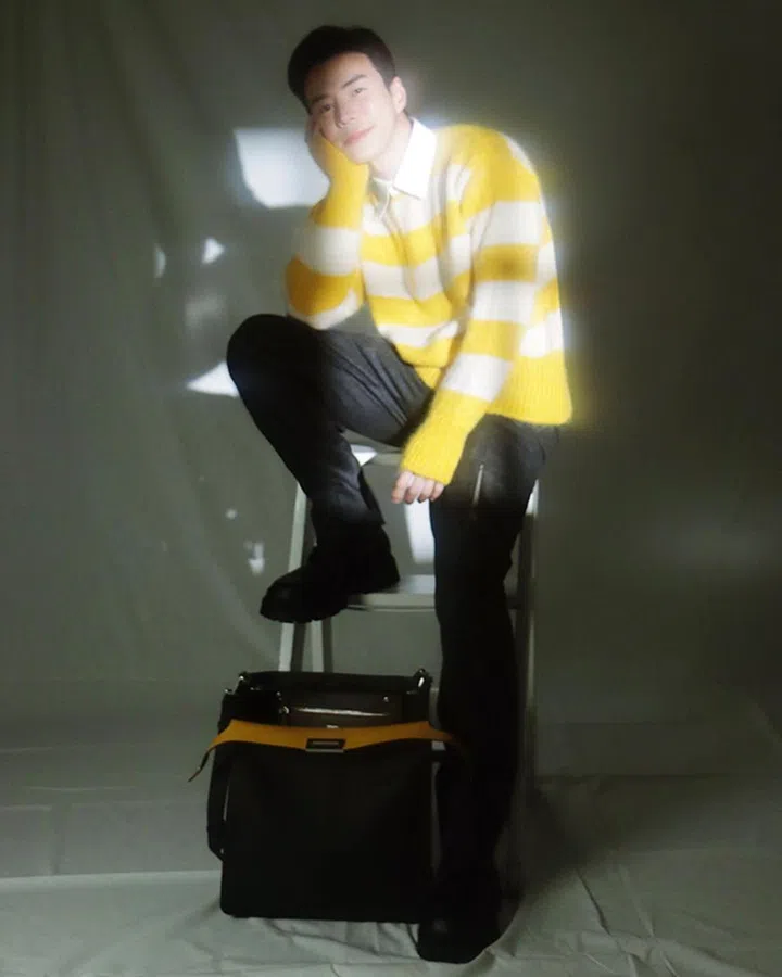 最近返新拍戏的王冠逸,以一袭黄白条纹套衫及Fendi经典的Peekaboo包登场,完美演绎慵懒的暖男时尚。