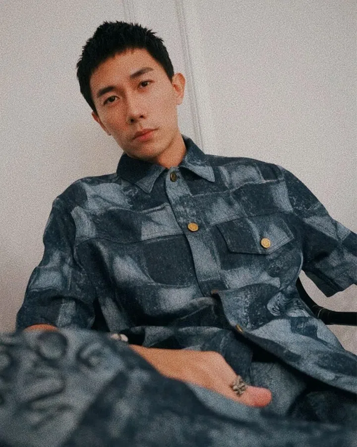 陈泂江身穿Louis Vuitton 2021早秋系列格纹牛仔装宅家看品牌男装秀直播,大展酷帅的牛仔范。