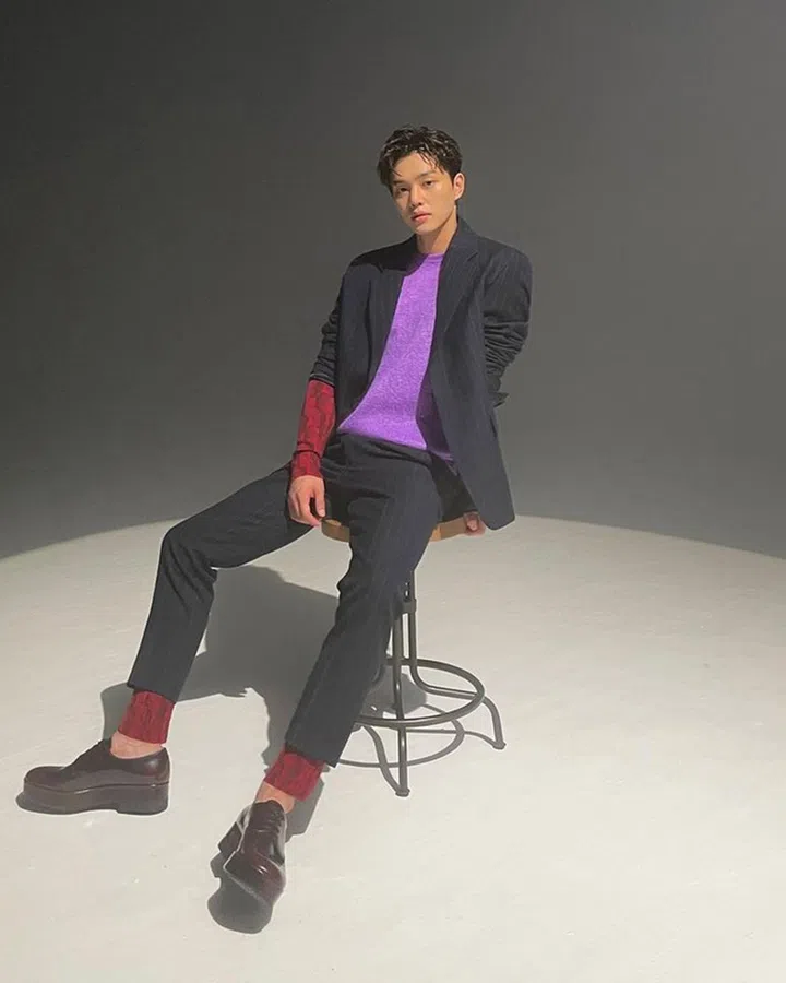 人气男星宋江韩剧一部接着一部,继《如蝶翩翩》新剧《无法抗拒的他》也开播了。这身Prada黑西装内搭紫色套衫及红色印花连衣裤,为基本款注入强烈的时尚个性。