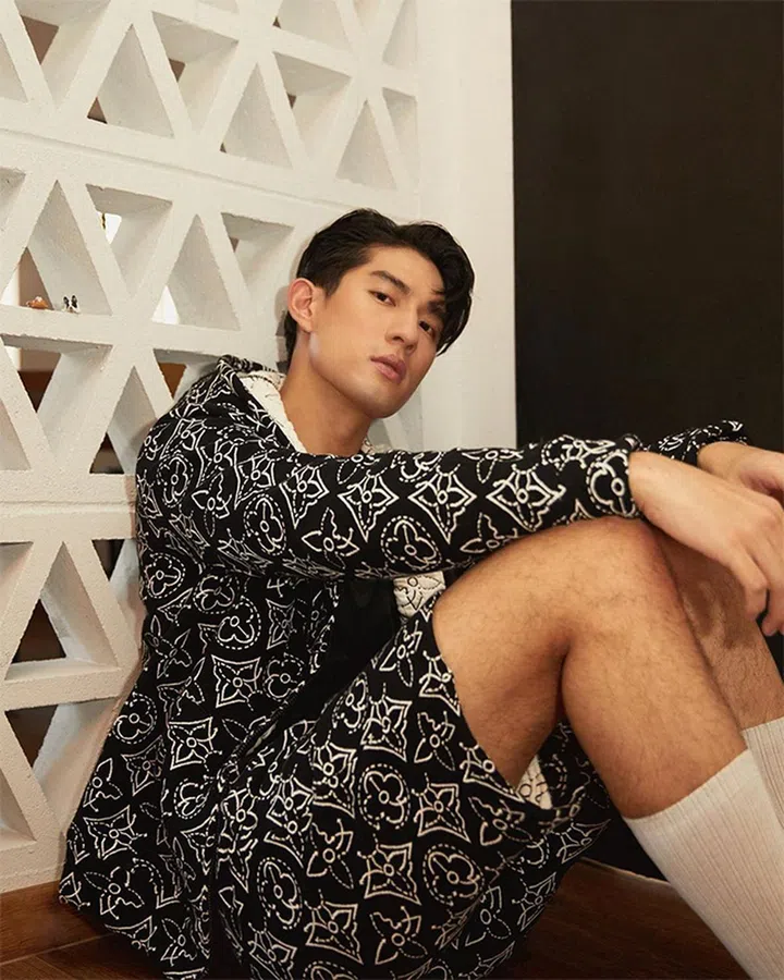 孙政则以Louis Vuitton标记行的monogram刺绣运动外套及短裤“宅家”出席男装周,穿出阳光的少男感。