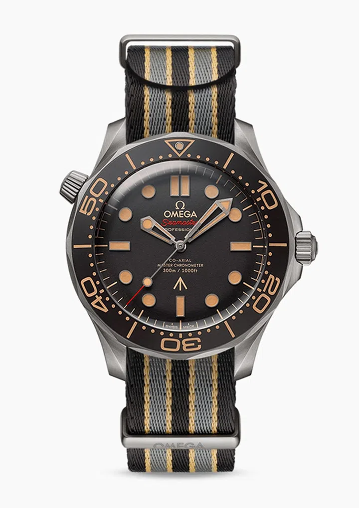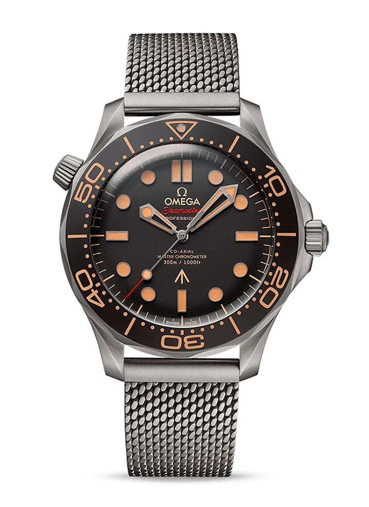 这款42mm的Seamaster腕表,与电影《No Time To Die》中的腕表相同。表款采用坚固轻盈的二级钛金属,咖啡色铝质表圈和表面动感十足,内里搭载品牌Co-Axial Master Chronometer机芯8806,精准度和防磁性能都达到业界最高标准。